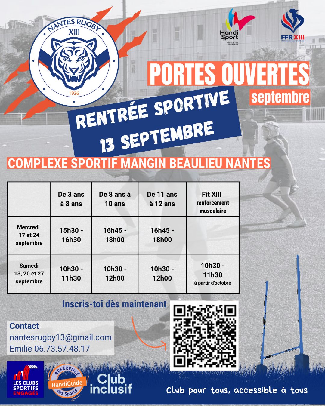 Pour l’école de rugby, inscription aux portes ouvertes via le QR code ci-dessous et pour les autres catégories, informations via contact@nantesrugby13.fr