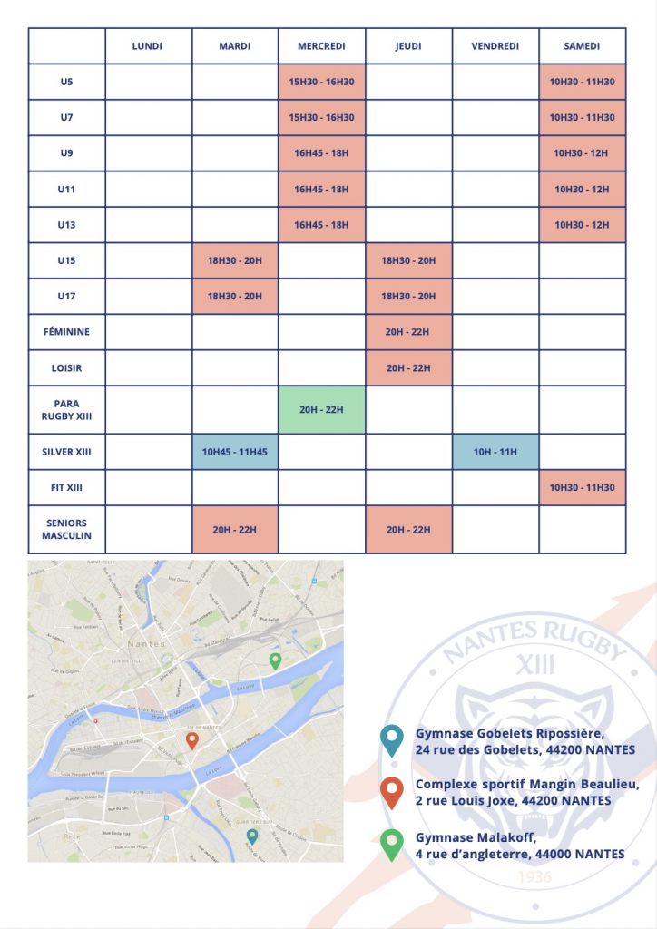 • au stade Mangin, sur l’île de Nantes pour l’école de rugby, les loisirs, les féminine, le fit, les seniors, et les équipes jeunes